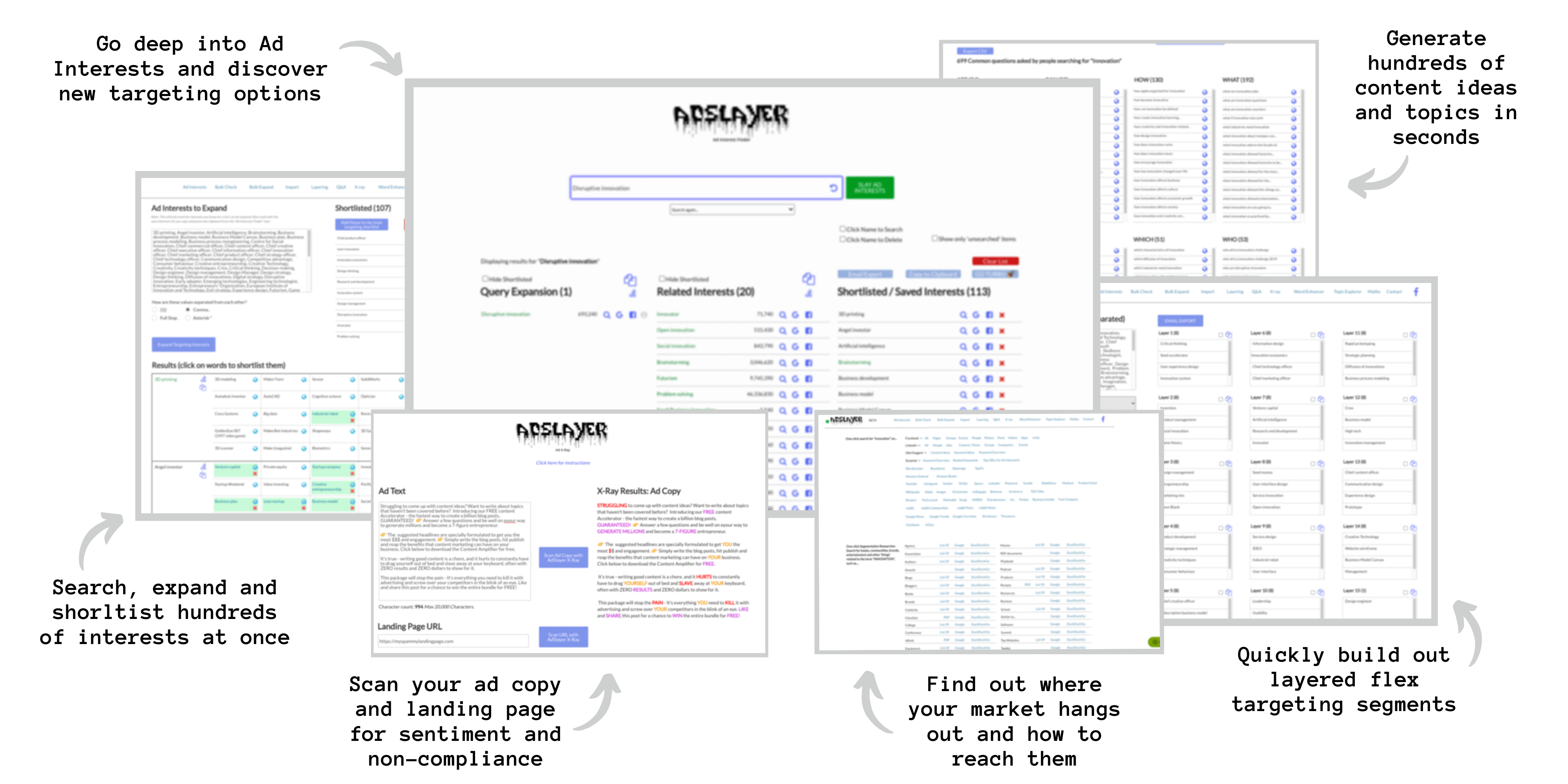 AdSlayer is a set of growth hacking tools, techniques and shortcuts that help you do your marketing work faster and more effectively.